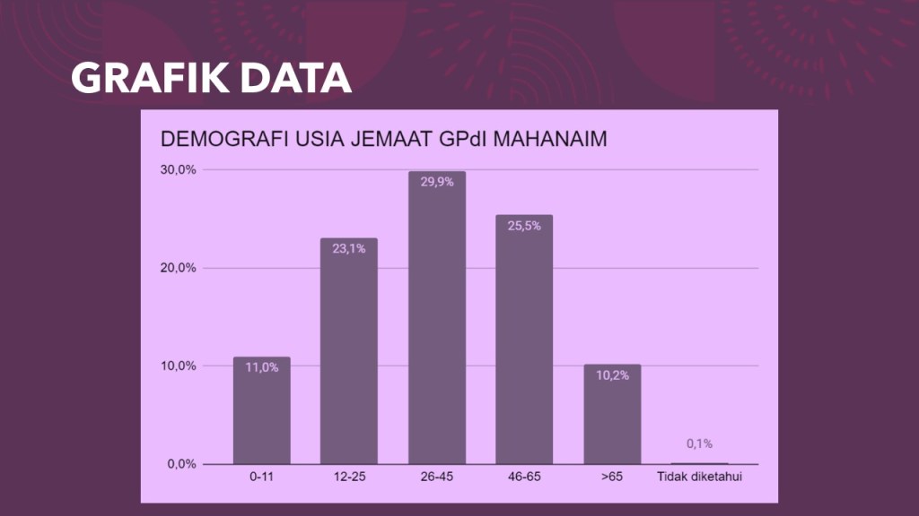 Gembala sudah pernah menyampaikan tentang kesempatan yang kita miliki dalam hidup ini, sebelum Tuhan Yesus datang kedua kali, atau sebelum kita meninggalkan tubuh yang fana ini dalam kematian fisik. Karena tidak semua dari kita akan mati dalam 50 tahun dari sekarang bukan? Berdasarkan data demografi jemaat yang dilakukan Tim Penelitian dan Pengembangan (Litbang) GPdI Mahanaim atas seluruh jemaat yang terdaftar per tahun 2021, kita bisa lihat sebaran kelompok usia di Mahanaim dari data grafik di bawah ini: