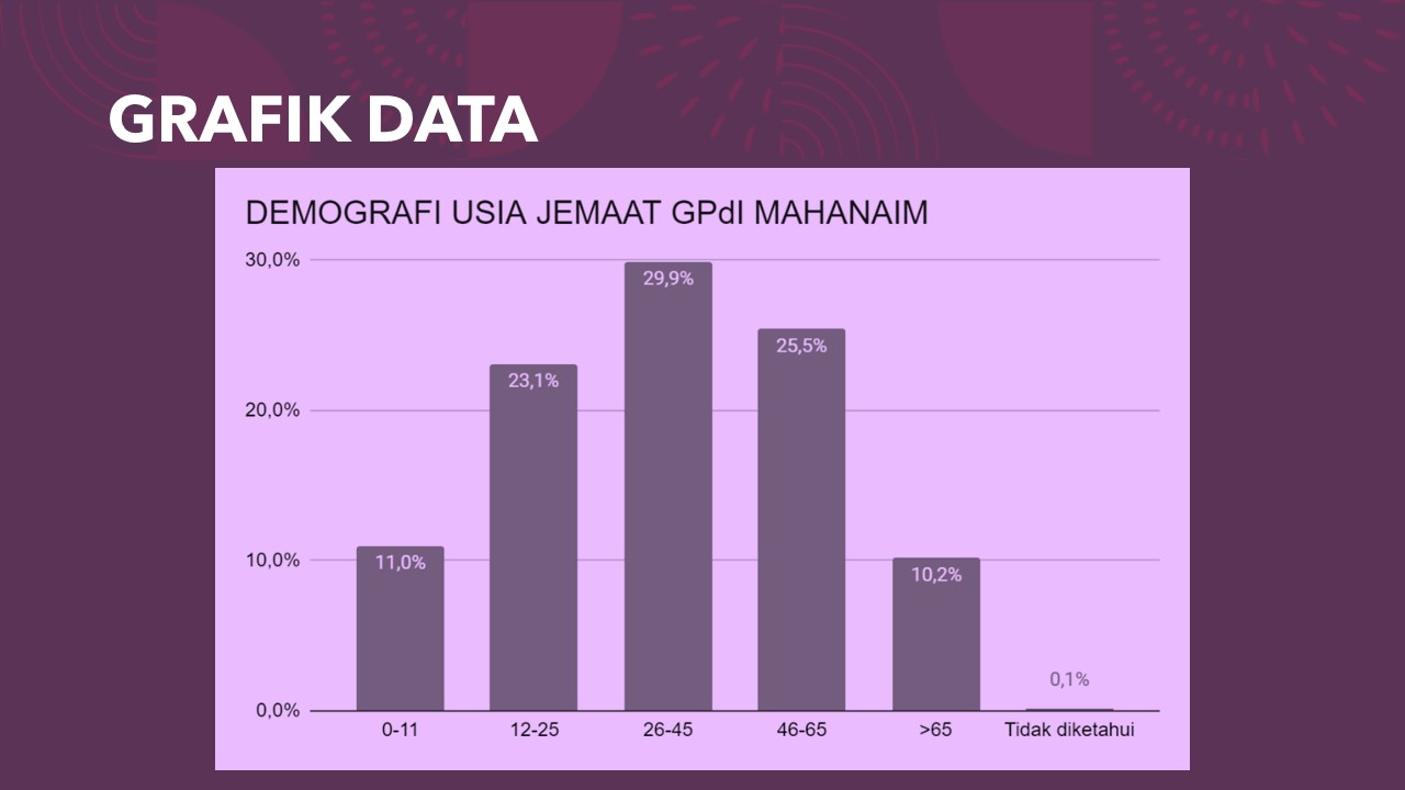 Gembala sudah pernah menyampaikan tentang kesempatan yang kita miliki dalam hidup ini, sebelum Tuhan Yesus datang kedua kali, atau sebelum kita meninggalkan tubuh yang fana ini dalam kematian fisik. Karena tidak semua dari kita akan mati dalam 50 tahun dari sekarang bukan? Berdasarkan data demografi jemaat yang dilakukan Tim Penelitian dan Pengembangan (Litbang) GPdI Mahanaim atas seluruh jemaat yang terdaftar per tahun 2021, kita bisa lihat sebaran kelompok usia di Mahanaim dari data grafik di bawah ini: