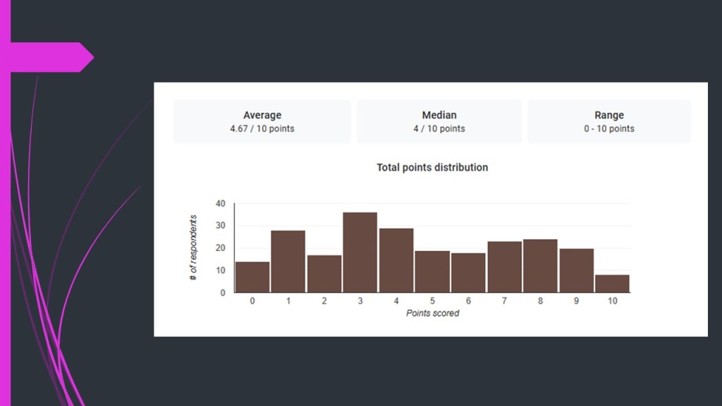 Secara rata-rata peserta yang mengisi kuis menunjukkan bahwa mereka memiliki hubungan pertemanan yang seimbang. Tetapi kalau diperhatikan di grafik pertama ada cukup banyak peserta yang hasil skornya tinggi. Ada kemungkinan mereka dalam “toxic friendship“.