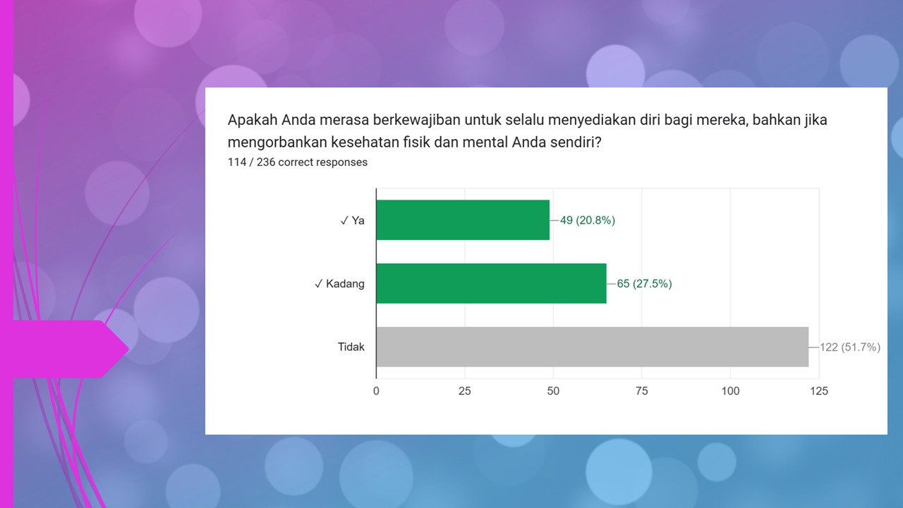 Salah satu pertanyaan dengan jawaban “ya” dan “kadang” tertinggi adalah saat peserta mau mengorbankan kesehatan fisik dan mental bagi pertemanan mereka.